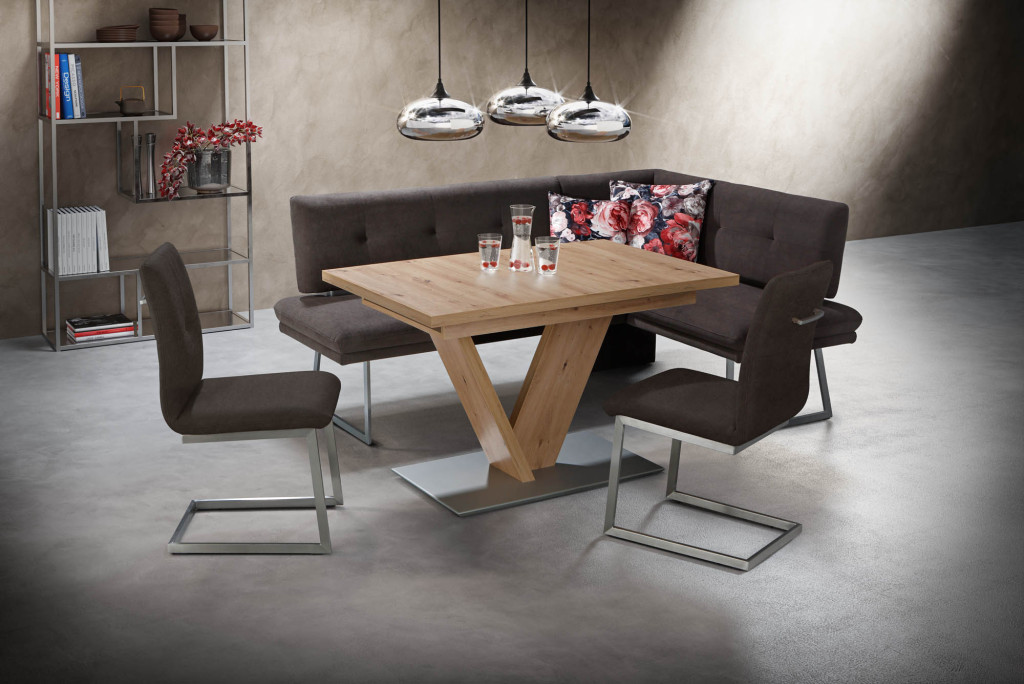 Als Einzelbank oder Eckbank erhältlich. In einer Vielzahl von Bezügen lieferbar. Auch das Untergestell kann zwischen 4-Fuß, Kufe oder Schwingstuhl gewählt werden.