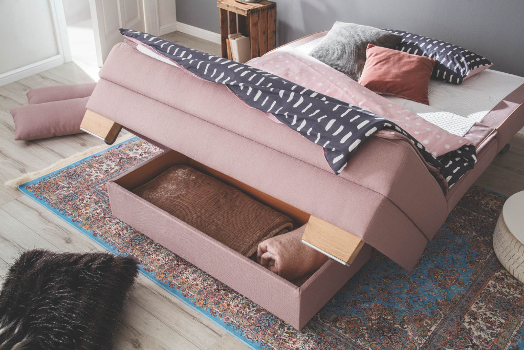 Faltbett in unterschiedlichen Breiten erhältlich, wahlweise mit Holz- oder Metallfüße, Optionaler Bettkasten bietet Stauraum.