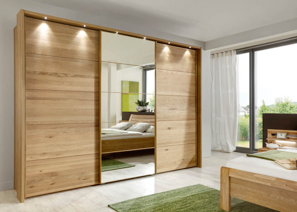 Schwebetürenschrank 3-türig, 2 Massivholz-Schwebetüren, mittig Spiegeltür in Parsol-Bronze-Spiegel mit Sprossen,BHT ca. 300/217/67 cm