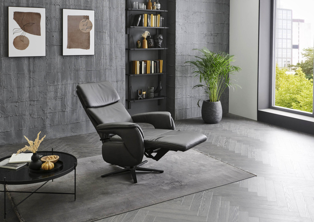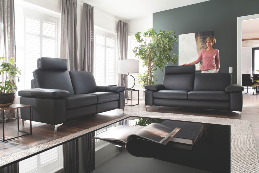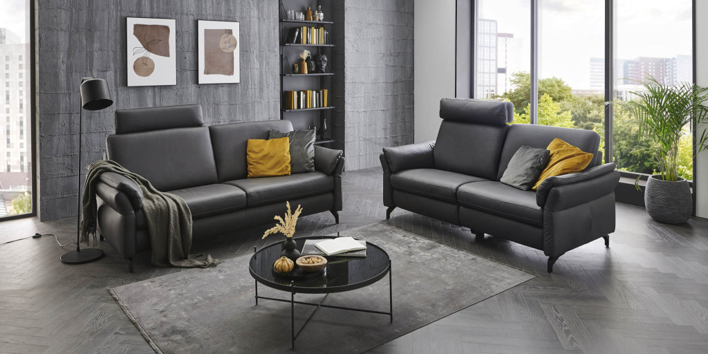Leder anthrazit, ohne Kontrastnaht, Federkern, Rücken echt, ARMTEIL 1, Metalleckfuß schwarz matt, Sitzhöhe 46 cm, Sitztiefe 55 cm, bestehend aus:
