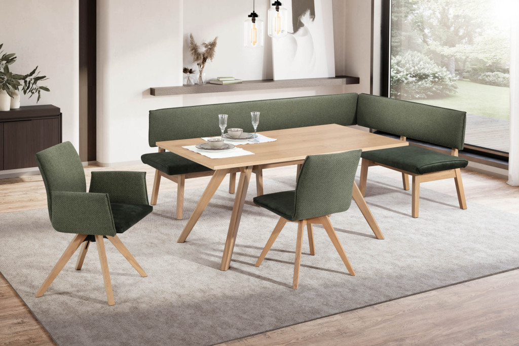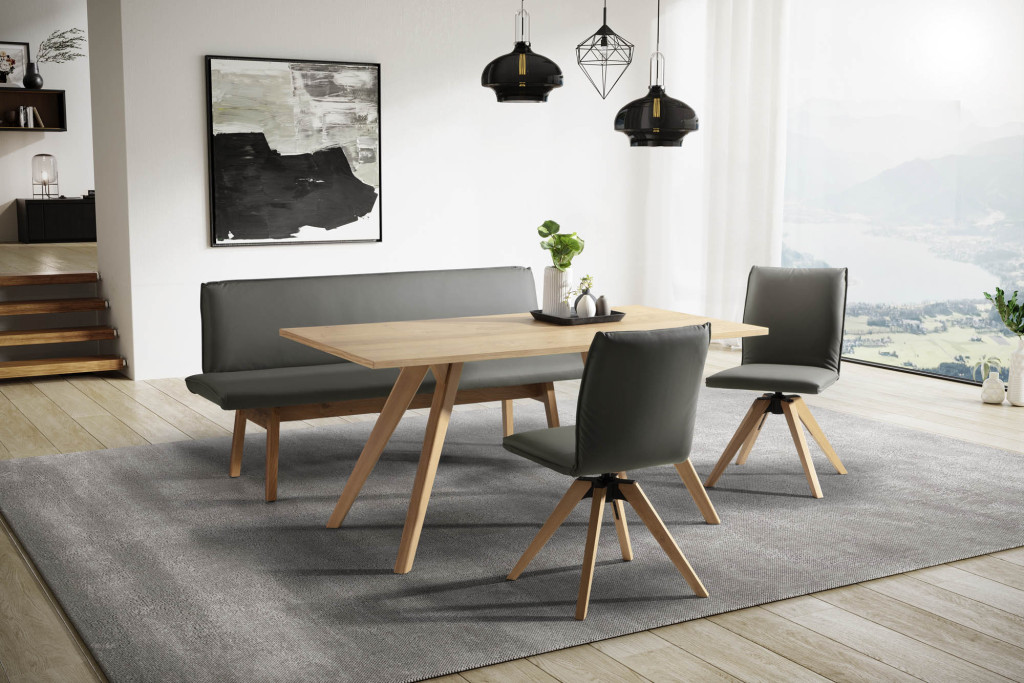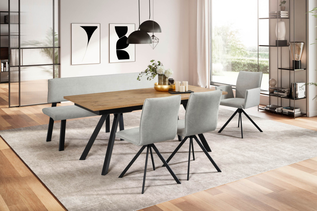 Dieses 4-teilige Set Holzart Dark Grey Dekor besteht aus einer Eckbank, einem Vierfußtisch und zwei gepolsterten Stühlen - alles in elegantem Hellgrau / Grau gehalten. Die Eckbank, ein wahres Highlight dieses Sets, besticht durch ihre linksseitige Länge von 195 cm und rechtsseitige Länge von 155 cm. Der im Set enthaltene Vierfußtisch misst 130 x 90 cm und bietet genügend Platz. Zwei bequeme Stühle runden unser Ensemble ab. Beide sind ebenso wie die Eckbank mit einer Polsterung auf Sitz und Lehne versehen.