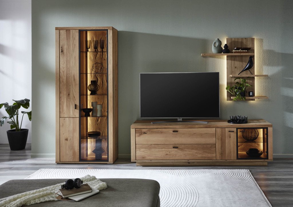 Front Eiche Lamelle massiv geölt, Alurahmen schwarzgrau, Korpus Eiche Artisan Melamin, sichtbare Rückwände Folie sandgestrahlt, Glas Parsolglas, Schubkästen mit Dämpfung, Kombi bestehend aus:
