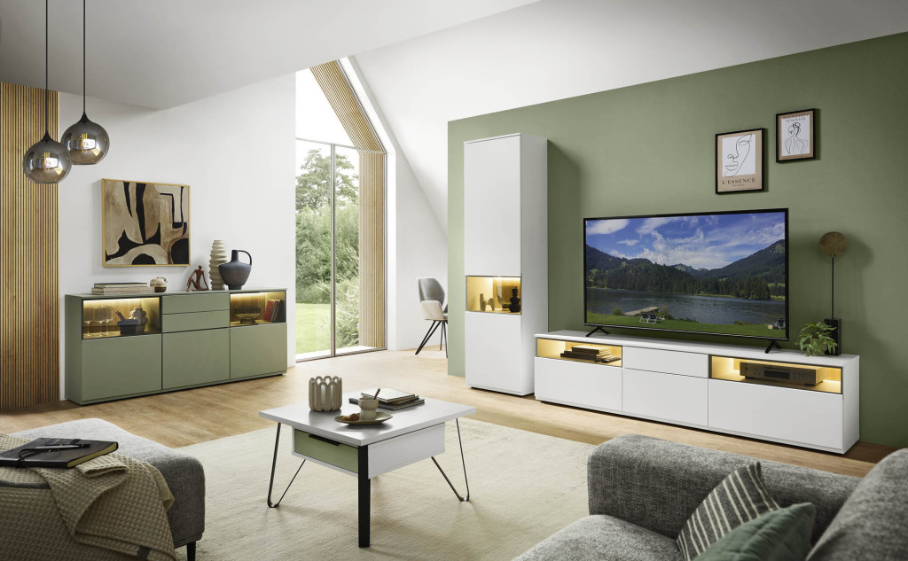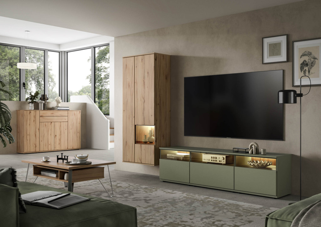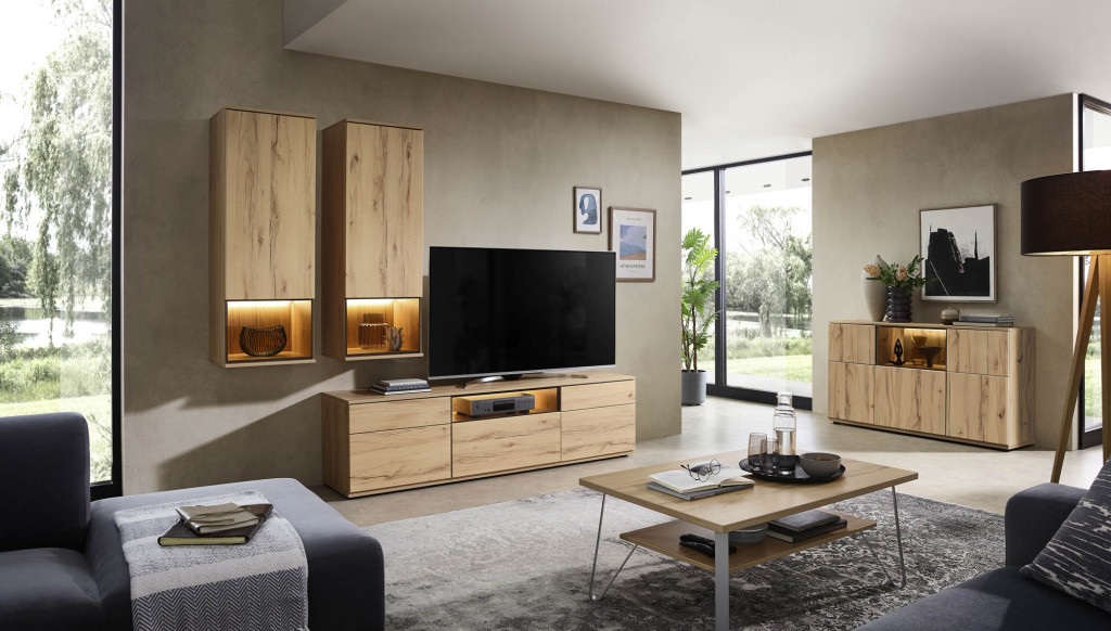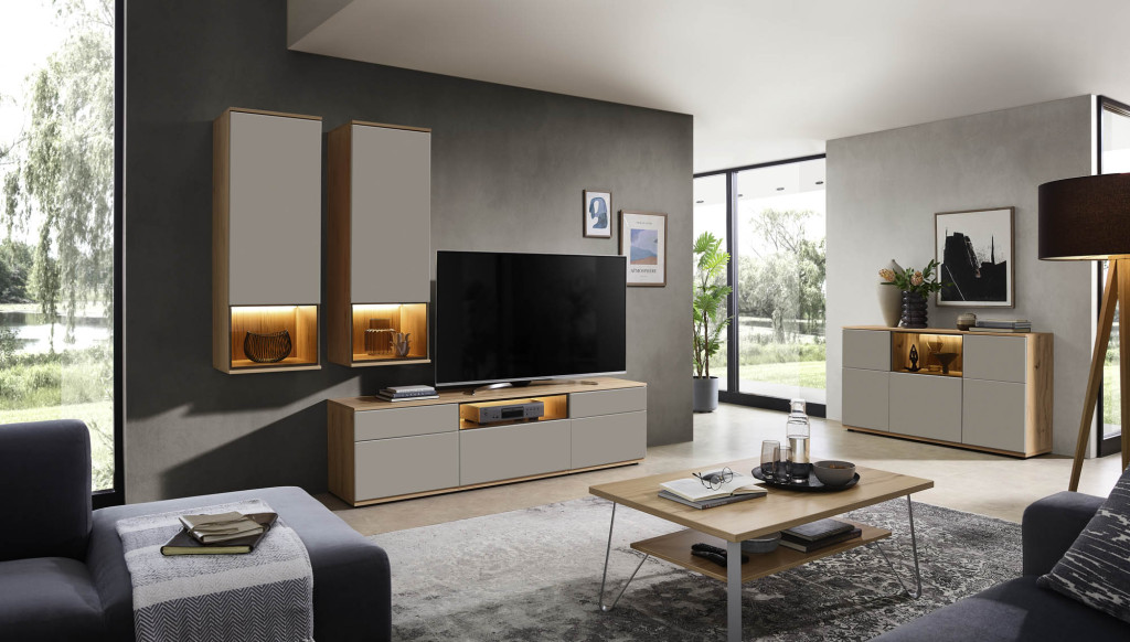 Die Wohnwand in edler Risseiche-Nachbildung überzeugt durch ihr harmonisches Design und die moderne Farbgebung in Sandbeige matt. Sie bietet großzügigen Stauraum und präsentiert sich als eleganter Blickfang in jedem Wohnraum. Hochwertige Materialien und eine sorgfältige Verarbeitung gewährleisten Langlebigkeit und Stabilität. Die Kombination aus offenen und geschlossenen Elementen ermöglicht eine individuelle Gestaltung und schafft Platz für Dekoration sowie Multimedia-Geräte. Diese Wohnwand verleiht Ihrem Zuhause eine warme, stilvolle Atmosphäre und vereint Funktionalität mit zeitloser Eleganz – ideal für ein anspruchsvolles Wohnambiente.