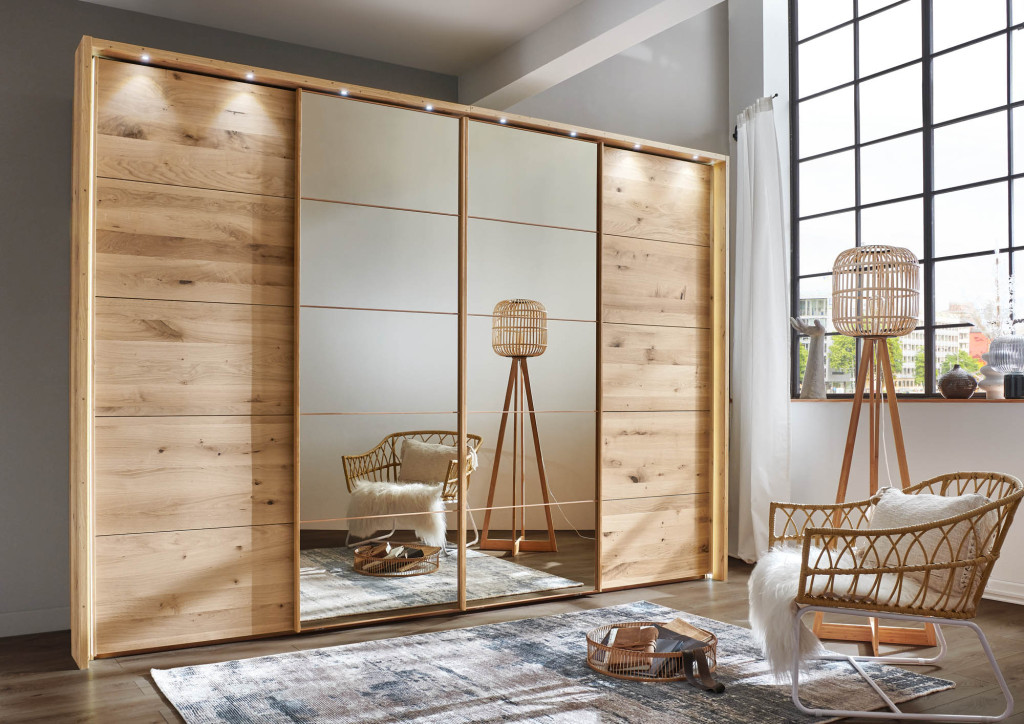 Schwebetürenschrank 3-türig, 2 Massivholz-Schwebetüren, mittig Spiegeltür in Parsol-Bronze-Spiegel mit Sprossen,BHT ca. 300/217/67 cm