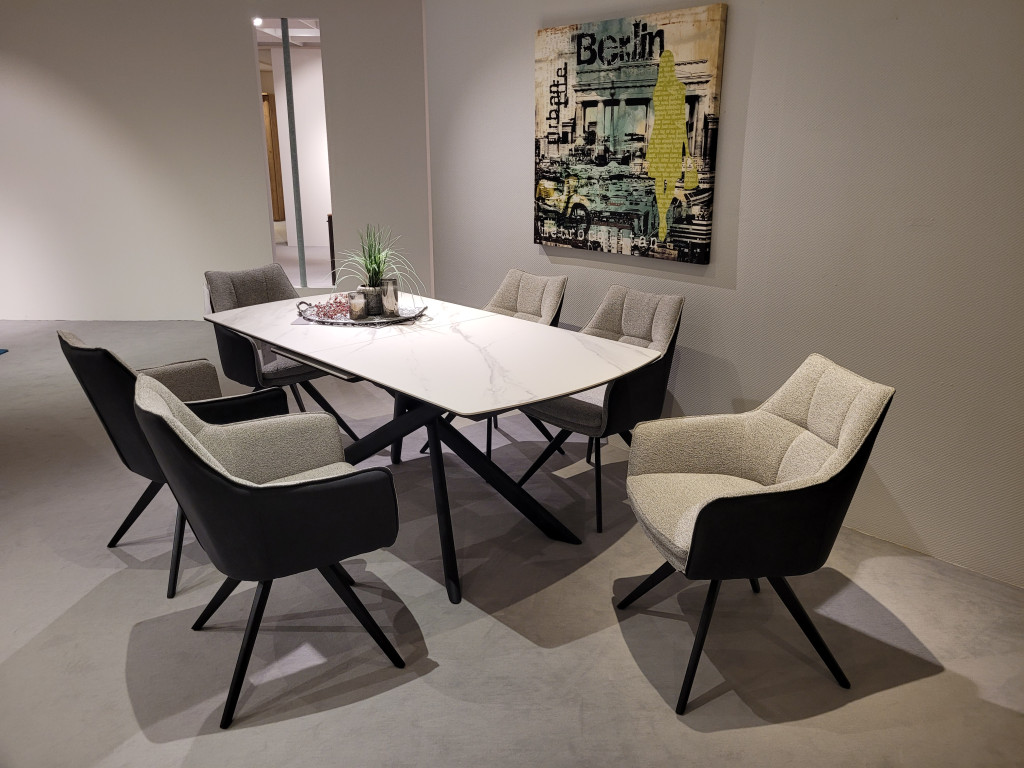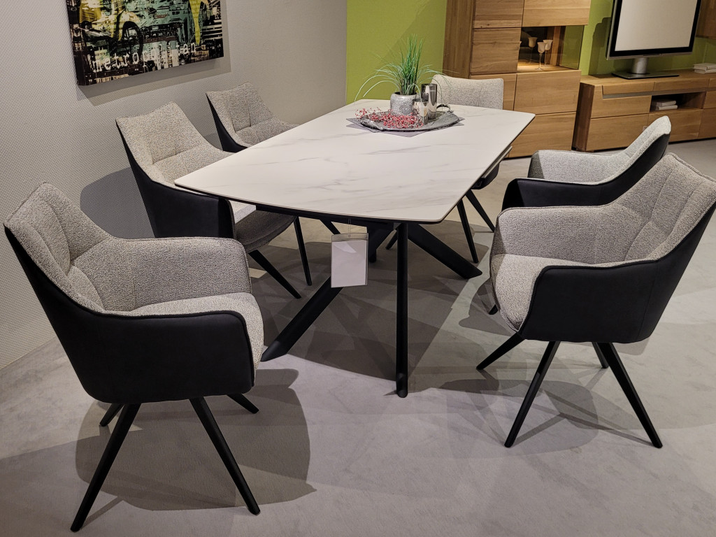 Keramik: weiß marmoriertGestell: Metall schwarz mattmit EinlegeplatteAbholpreisohne Stühle, ohne Dekoration